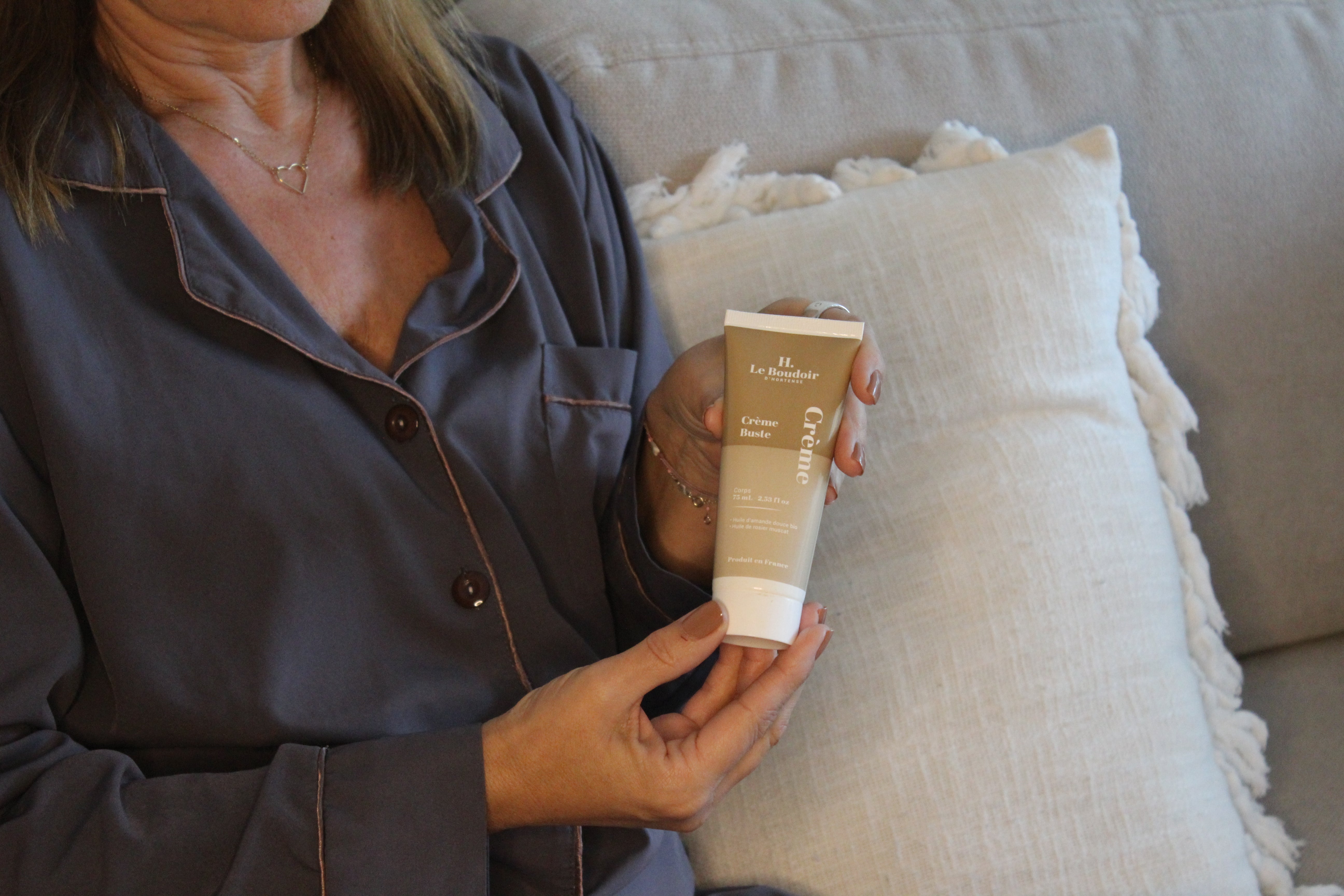 • Application : Masser délicatement le buste en mouvements circulaires, en remontant vers le cou pour favoriser la fermeté et l’élasticité.