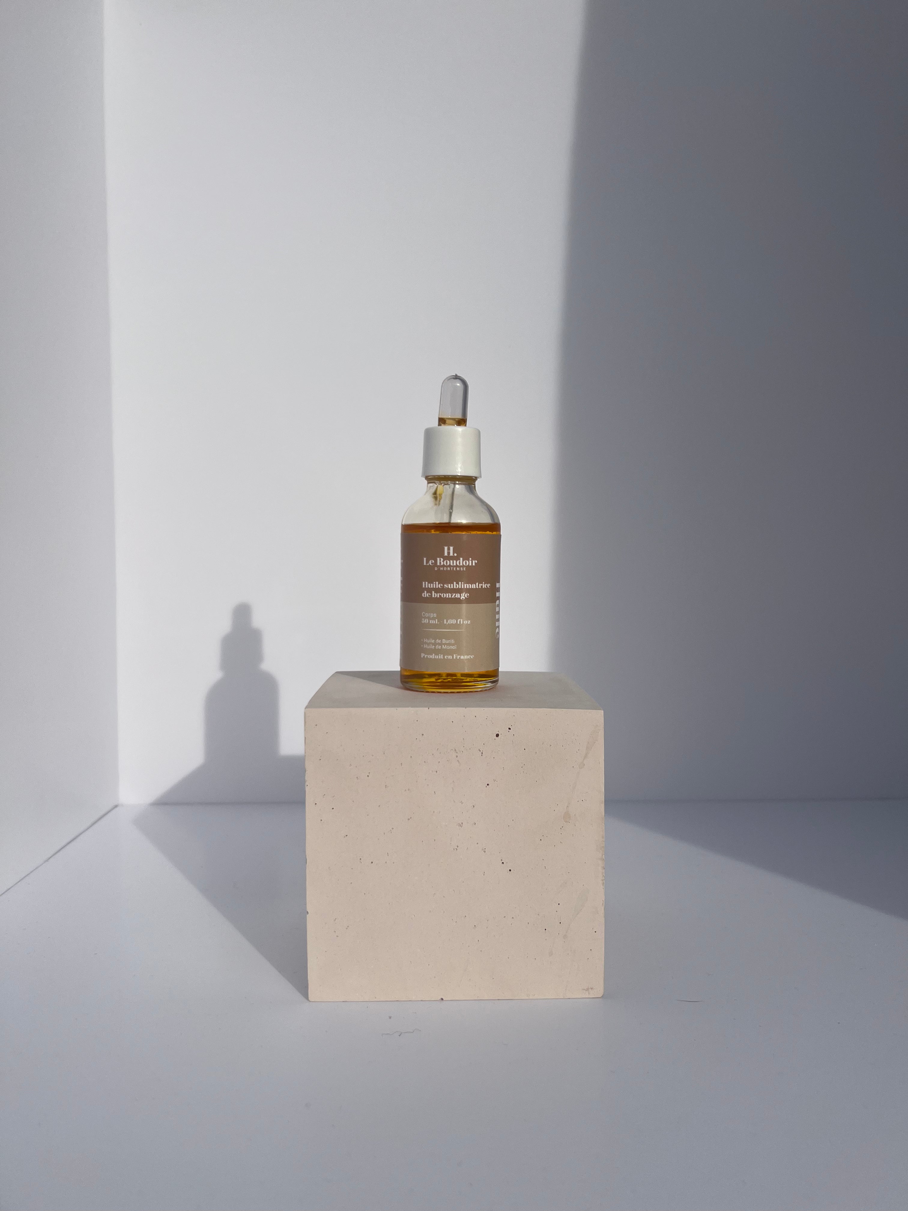 L’huile sublimatrice de bronzage est l’alliée idéale pour prolonger et sublimer votre bronzage tout en nourrissant votre peau. Enrichie en huile de buriti et en huile de monoï, elle laisse un fini satiné et lumineux, tout en enveloppant la peau d’une agréable odeur estivale rappelant les vacances. L’huile de buriti, riche en bêta-carotène, intensifie l’éclat du bronzage, tandis que l’huile de monoï hydrate et adoucit la peau pour un confort prolongé. Sa texture légère pénètre rapidement, laissant la peau douce et radieuse sans effet gras.